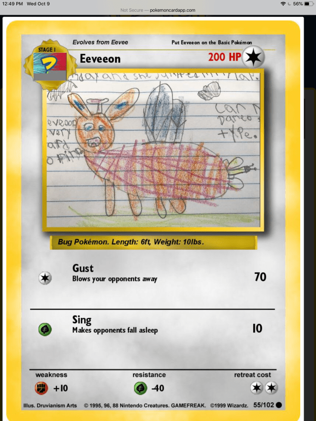 I created my own Pokémon named Eeveeon. Here is her Pokémon card and her first adventure.